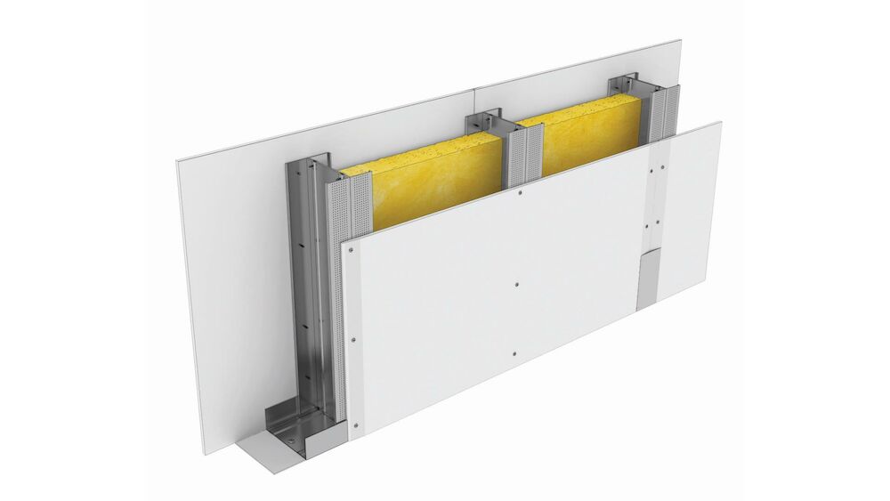 Perete tip D din gips-carton cu rezistenţă la foc EI30, realizat din montanţi verticali Nida Metal CW75 dublaţi și ghidaje orizontale Nida Metal UW75, simplu placat cu Nida Expert⁺ 12.5, cu vată minerală la interior.