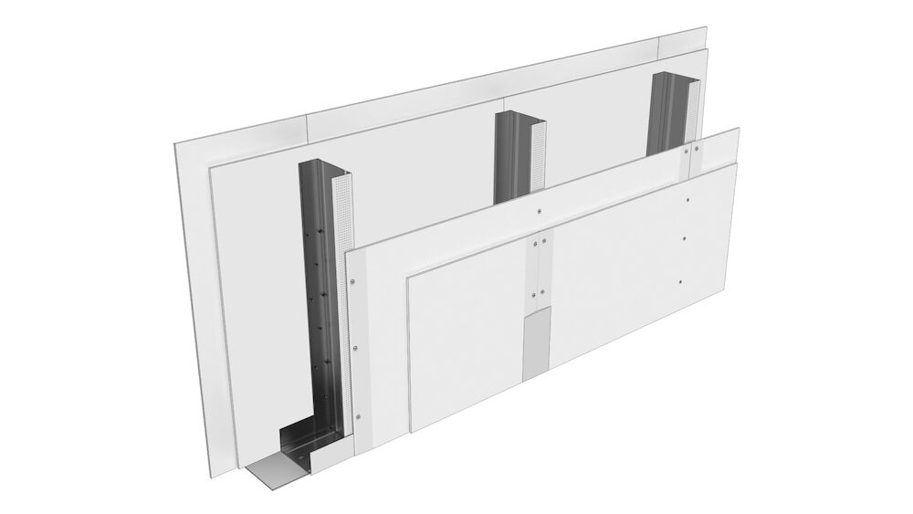 Perete tip D din gips-carton cu rezistenţă la foc EI90, realizat din montanţi verticali Nida Metal CW100 și ghidaje orizontale Nida Metal UW100, dublu placat cu Nida Flam 12.5 și Nida Expert⁺ 12.5.