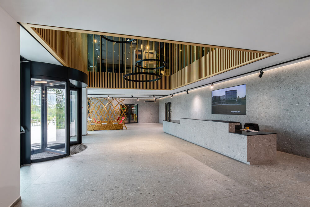 Confortul acustic al spațiilor de birouri de tip open space s-a obținut prin implementarea unor combinații de suprafețe reflectante și absorbante.